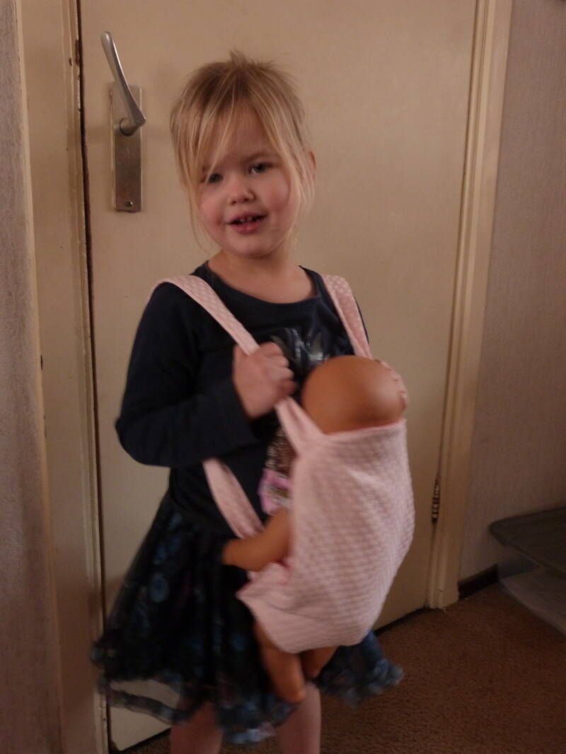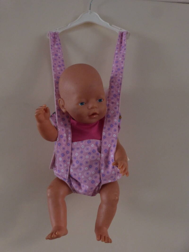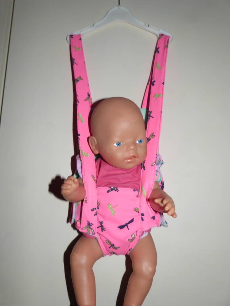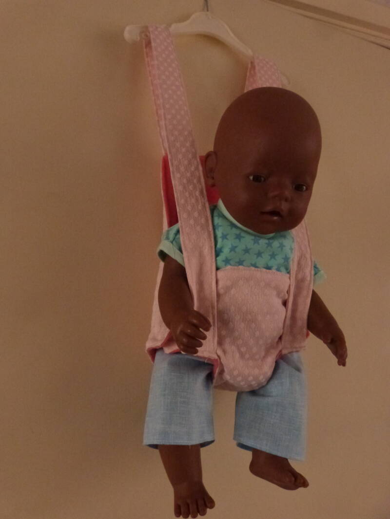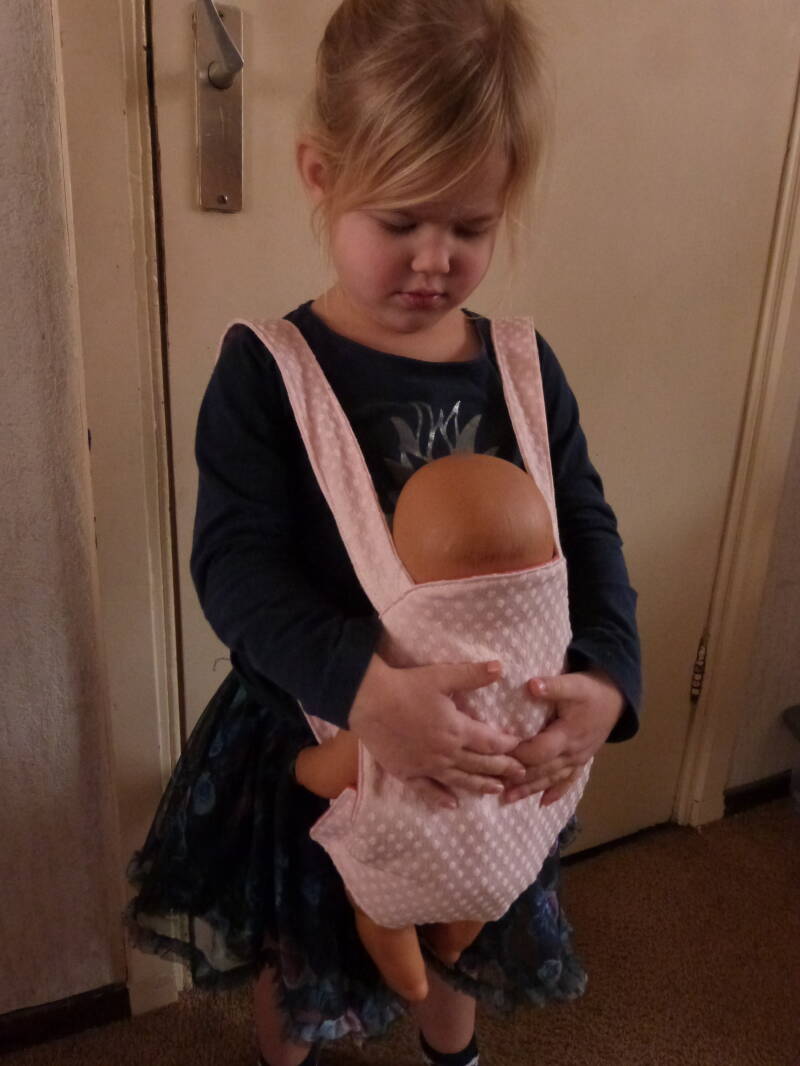 Leuke draagzak voor poppen. Mijn eigen poppenmoedertje wilde hem graag even uitproberen. De pop op de foto is een Baby Born van 43 cm.