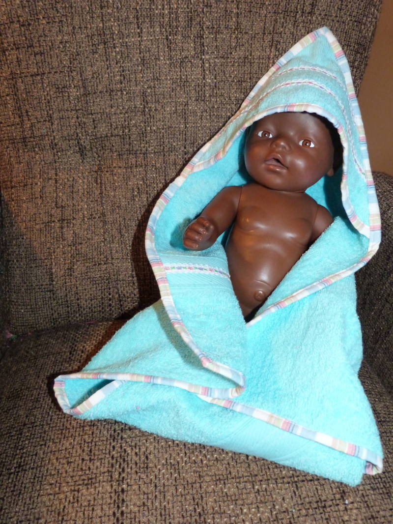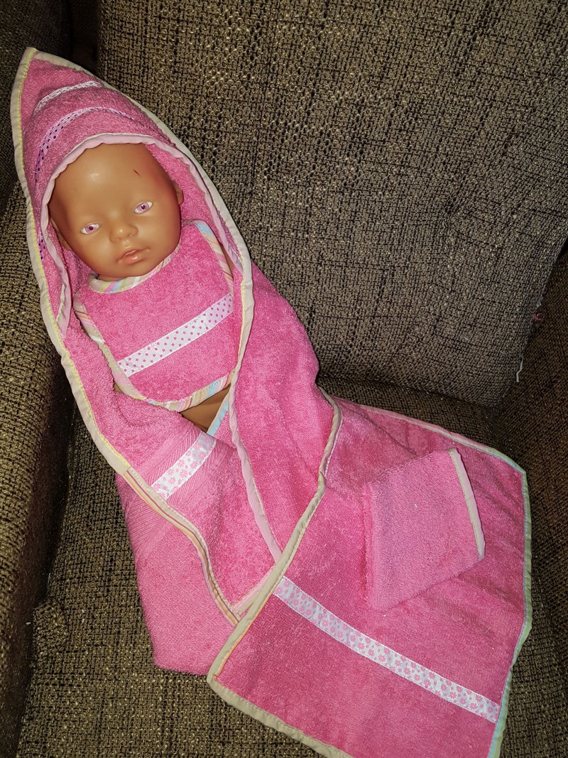 De setjes bestaan uit een badcape (50 x 50 cm), handdoekje, washandje en een slabbetje.